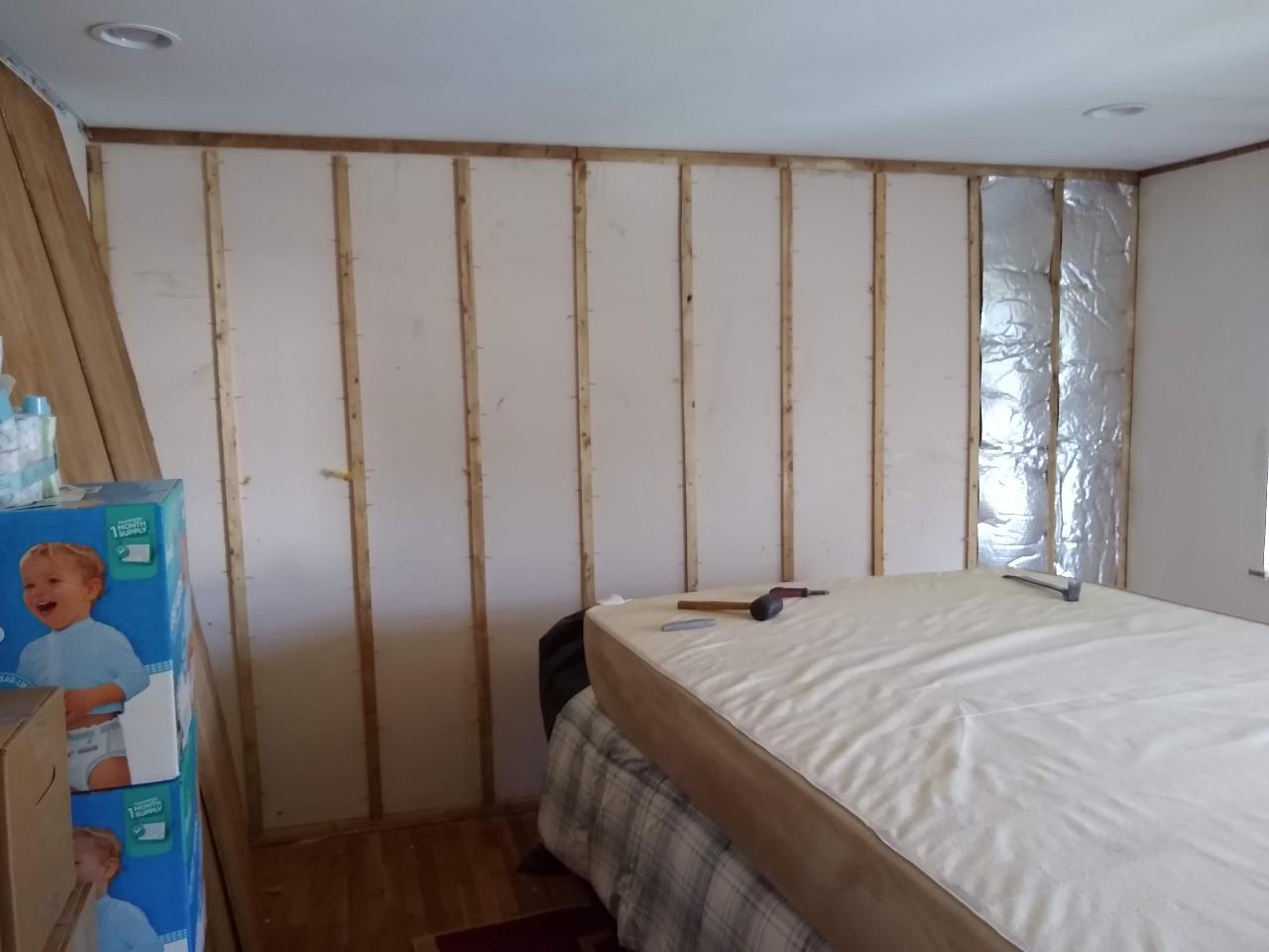 First order of business was to remove the paneling. Under that was a very thin layer of insulation, and furring strips. (08/12/2019)