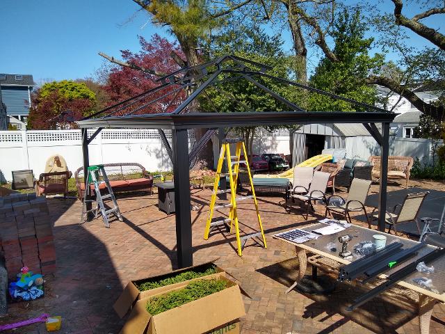 443: Success!  The threaded rods lines up with the existing holes in the pavers, and we dropped the gazebo legs right back on top.
