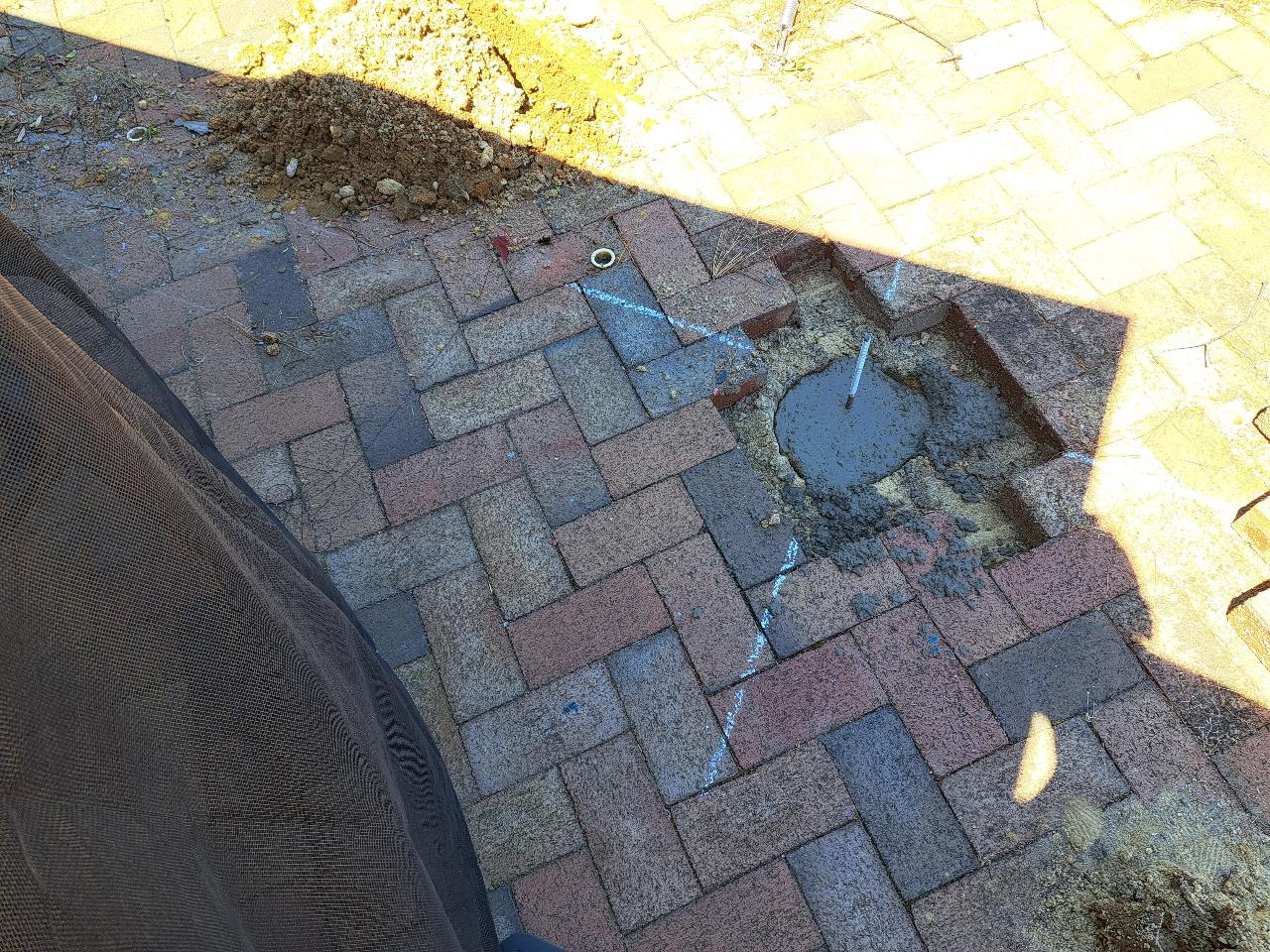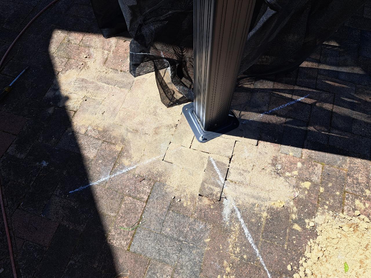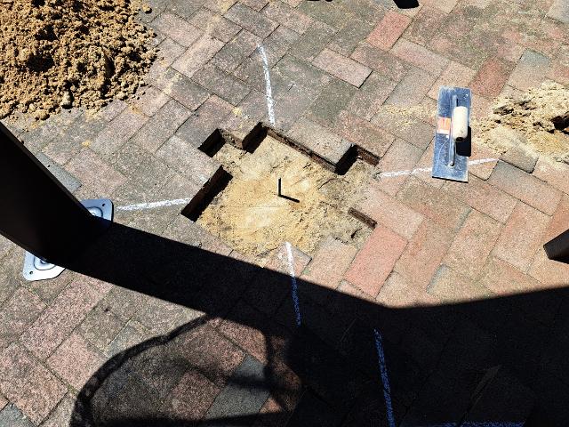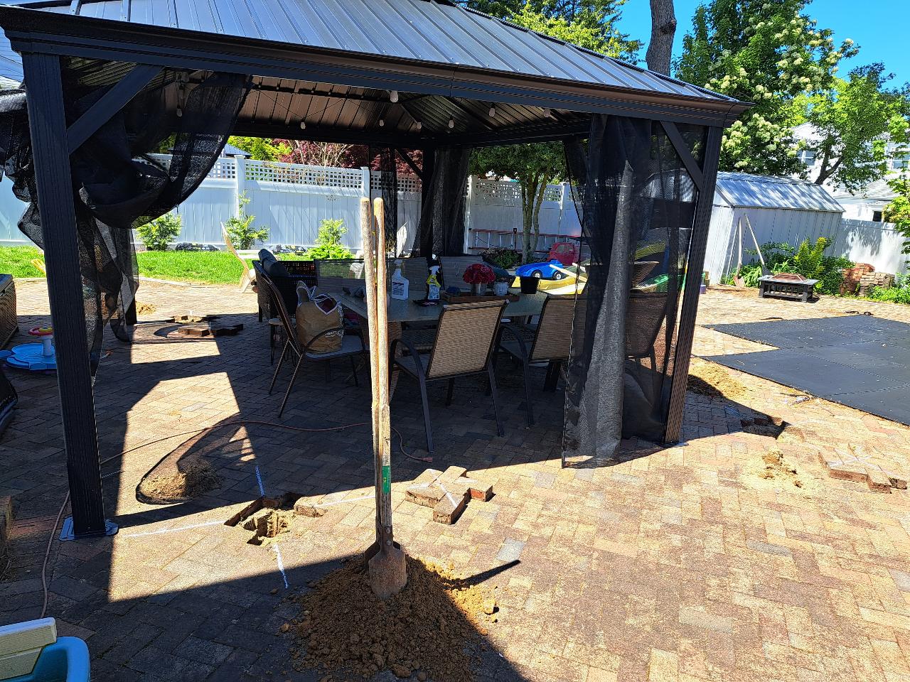 Now that we like the location of the gazebo, it's time to pour some footers so the wind wont take it away. First we move it out of the way a few feet and scribed some lines. We removed the bricks, and dug a three foot deep hole. (05/06/2023)