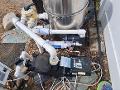 A few years back we installed a variable speed pump, which drastically cut our electric usage. This year, we converted to saltwater. Wih the price of chlorine, the unit will pay for itself in a season and a half. Here you can see the salt cell, flow switch, and sacrificial anode.
