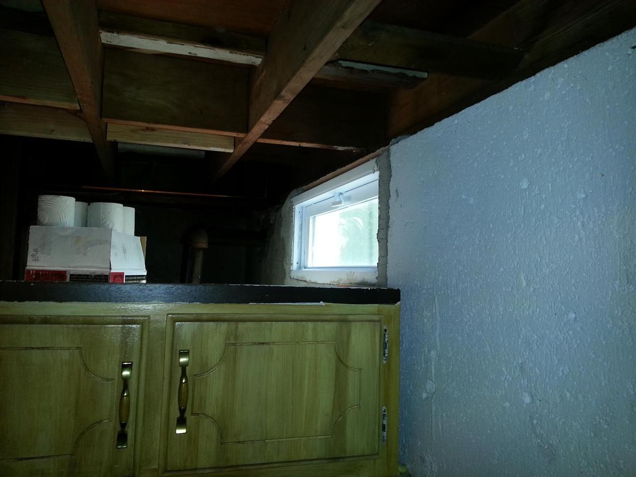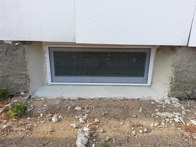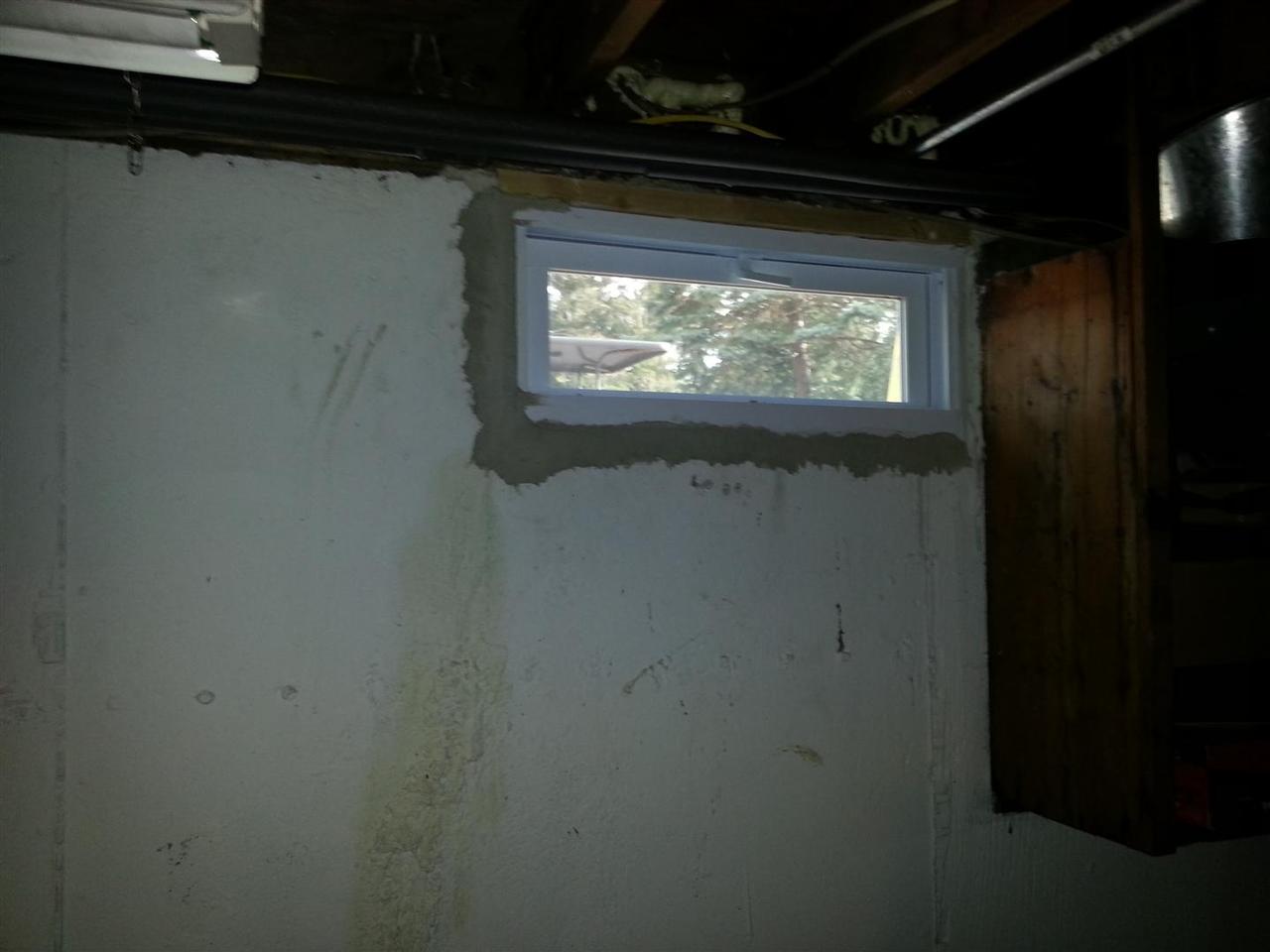There wasnt enough room to frame the windows out, so we simply grouted them in on the bottom and sides. We did place one 2x4 along the top on two windows where the top cement was removed. The 2x4 was caulked to the window frame, and then grouted into place against the foundation walls.(04/08/2013)